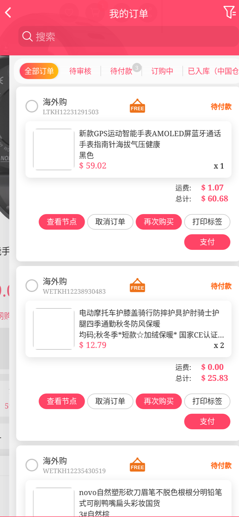 移动端代购搜索添加商品下单取消