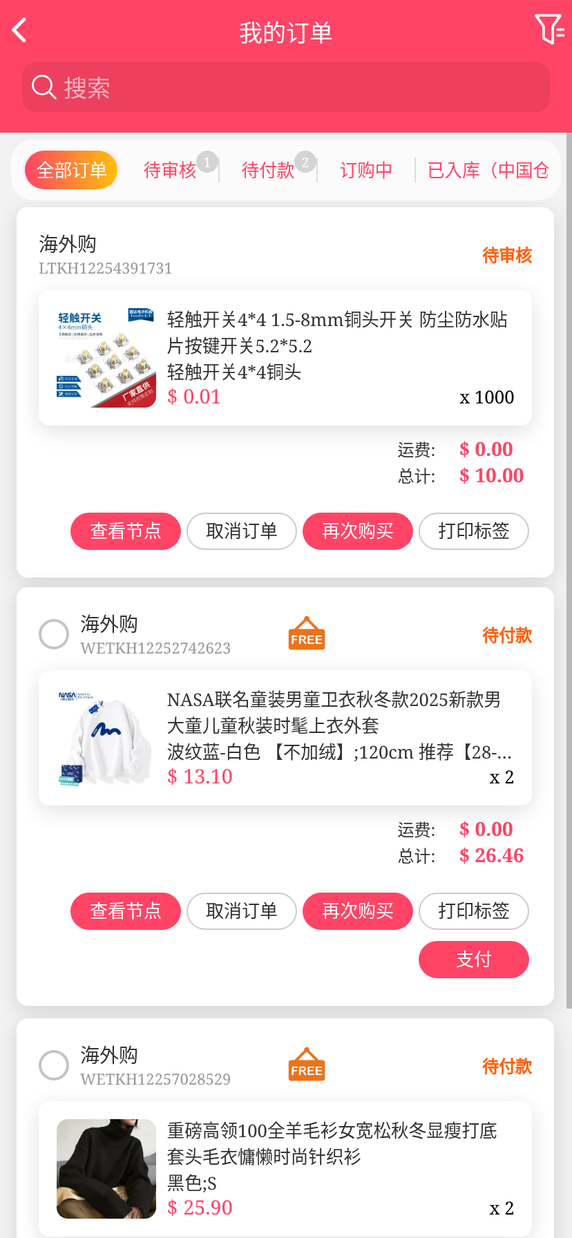 移动端代购搜索添加商品下单取消