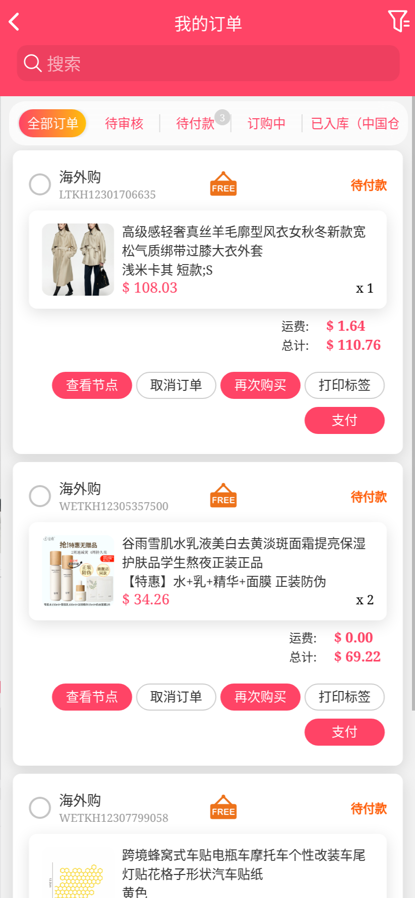 移动端代购搜索添加商品下单取消