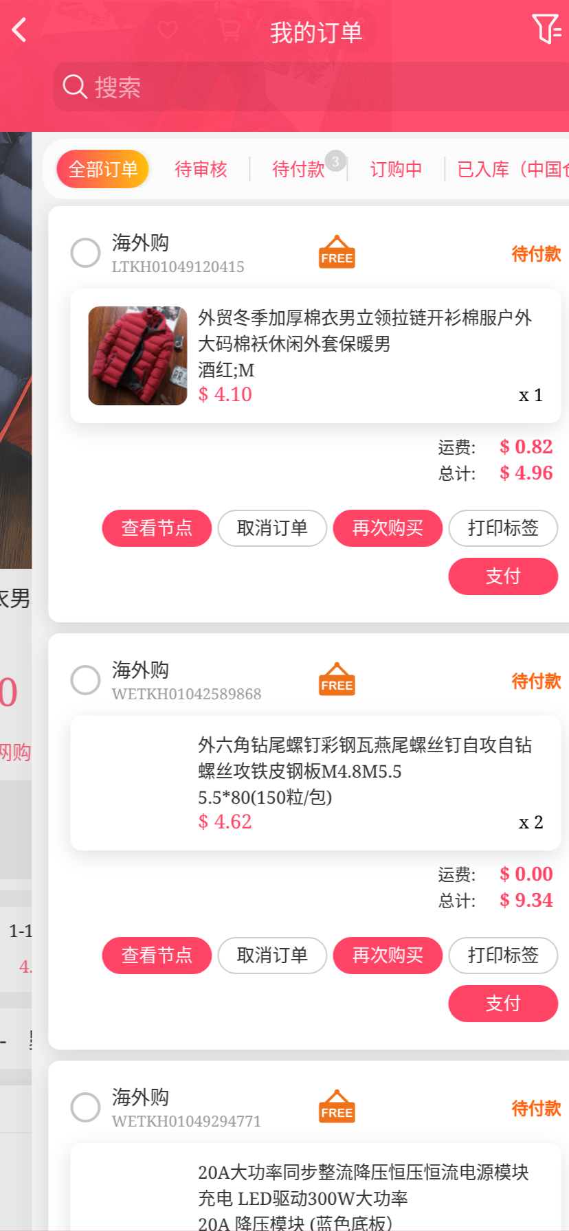 移动端代购搜索添加商品下单取消