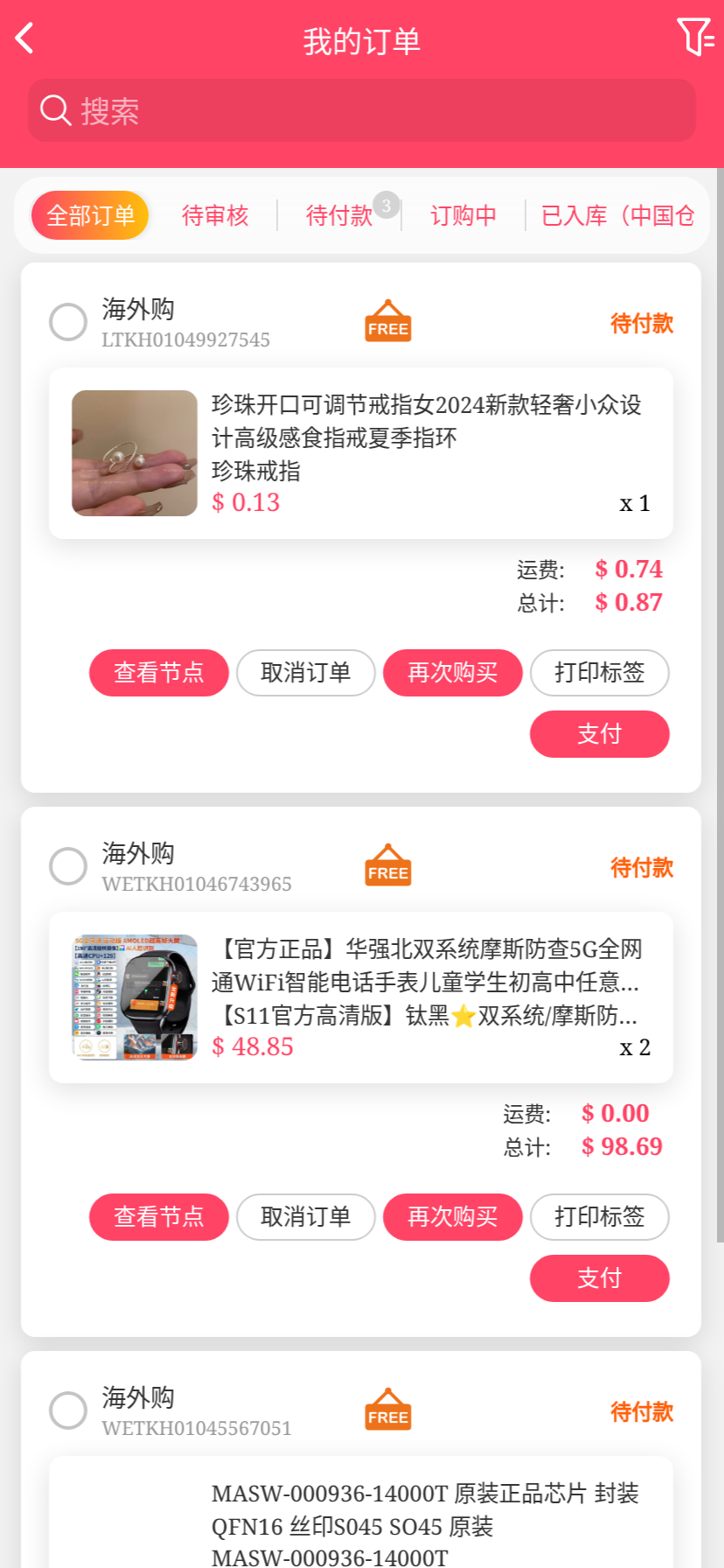 移动端代购搜索添加商品下单取消