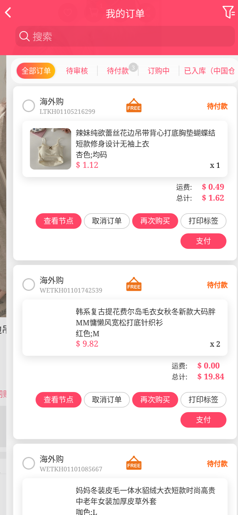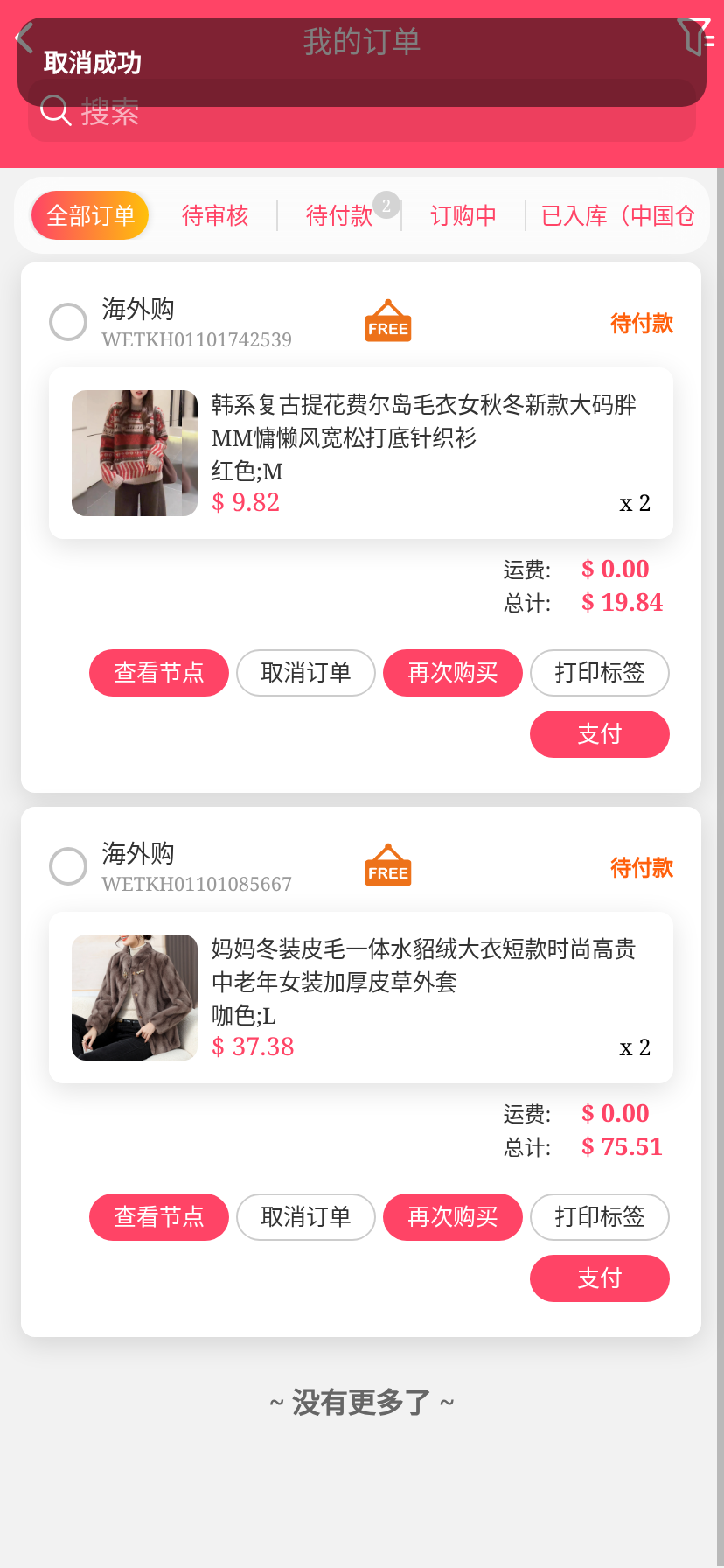 移动端代购搜索添加商品下单取消