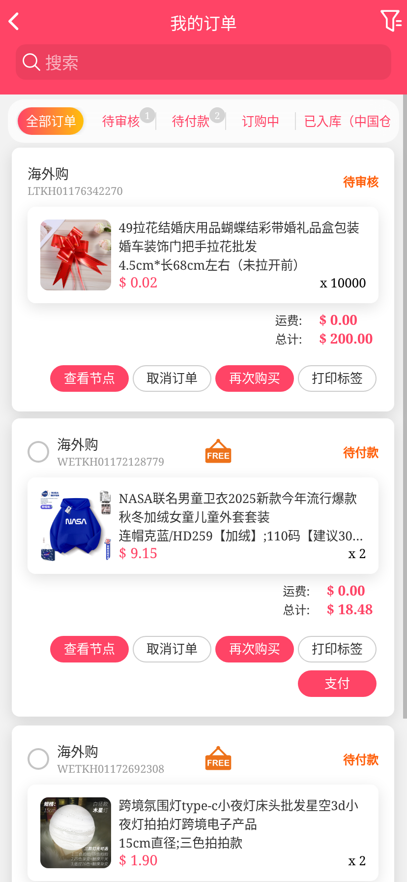 移动端代购搜索添加商品下单取消