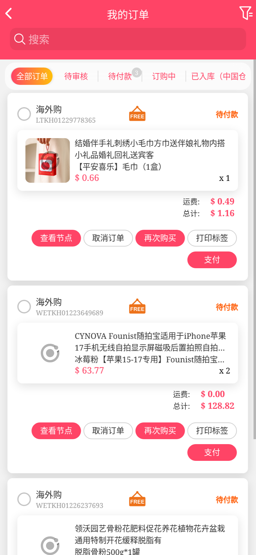移动端代购搜索添加商品下单取消