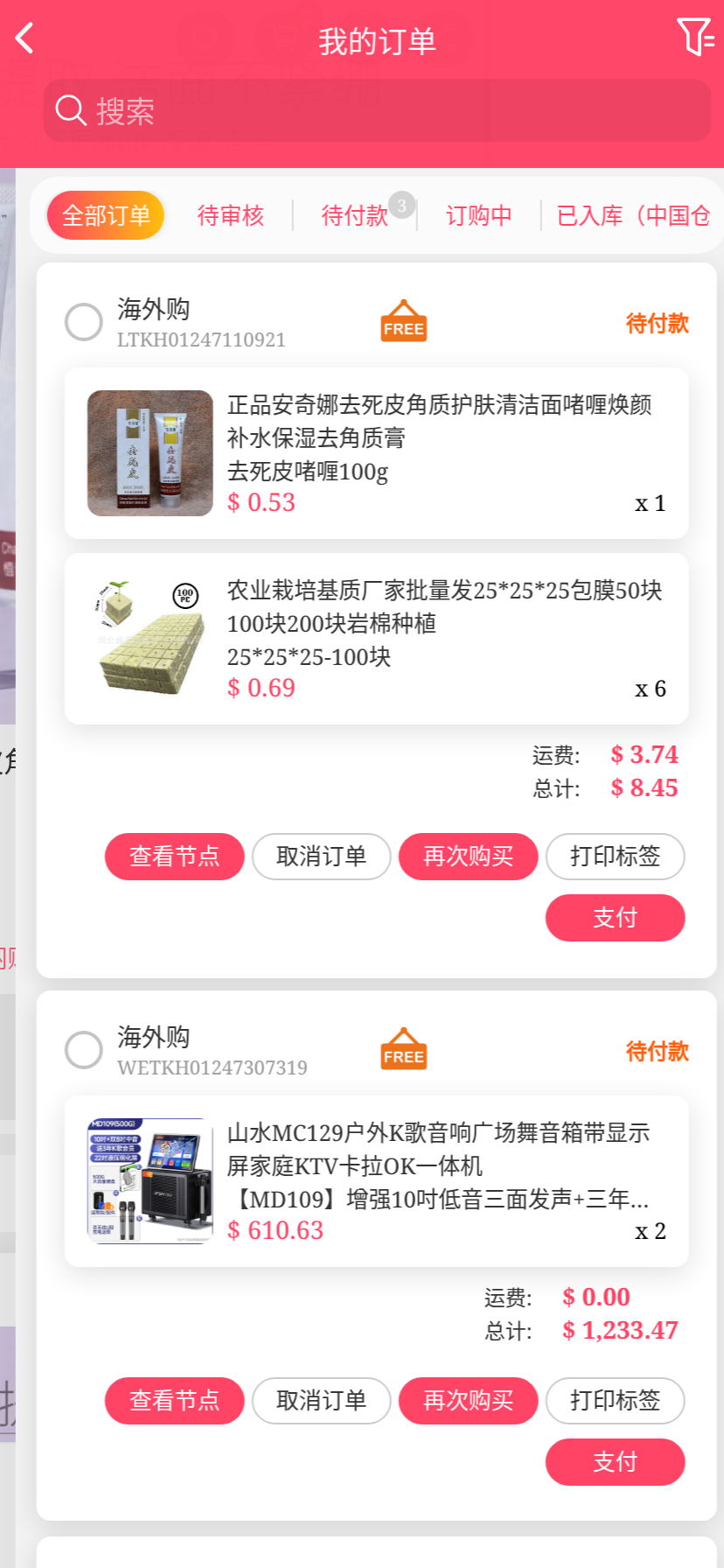 移动端代购搜索添加商品下单取消