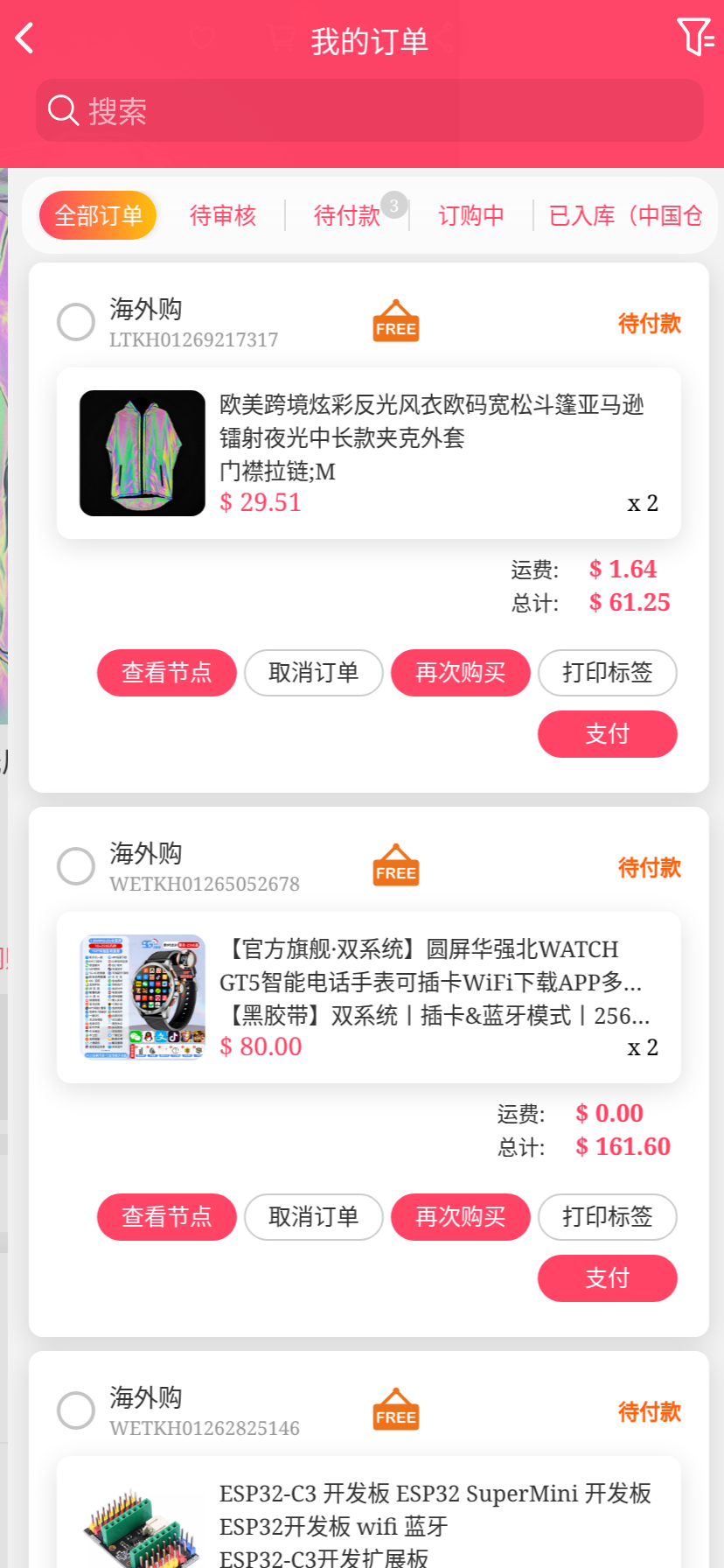 移动端代购搜索添加商品下单取消