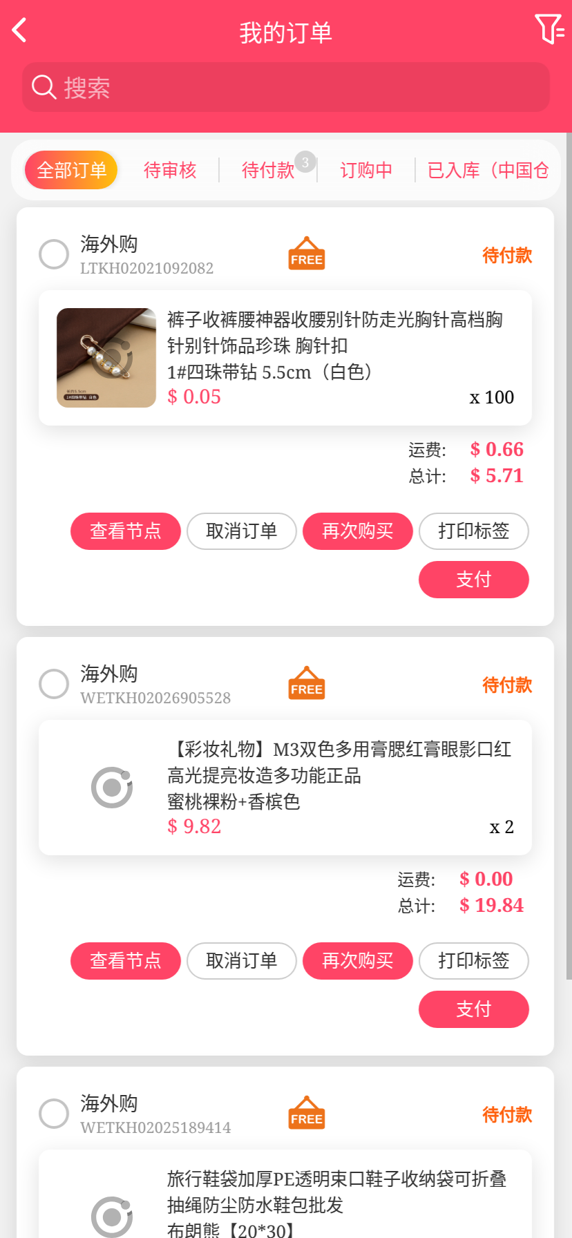 移动端代购搜索添加商品下单取消